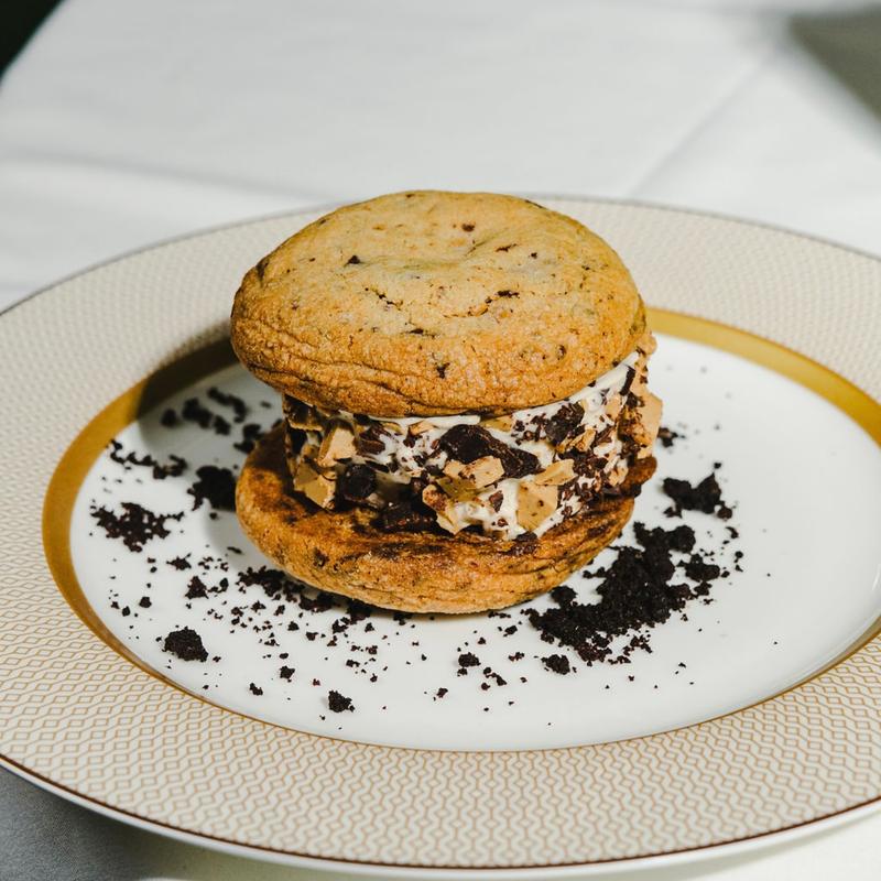 Freshly baked chocolate chunk cookie, hazelnut gelato, chocolate crumble